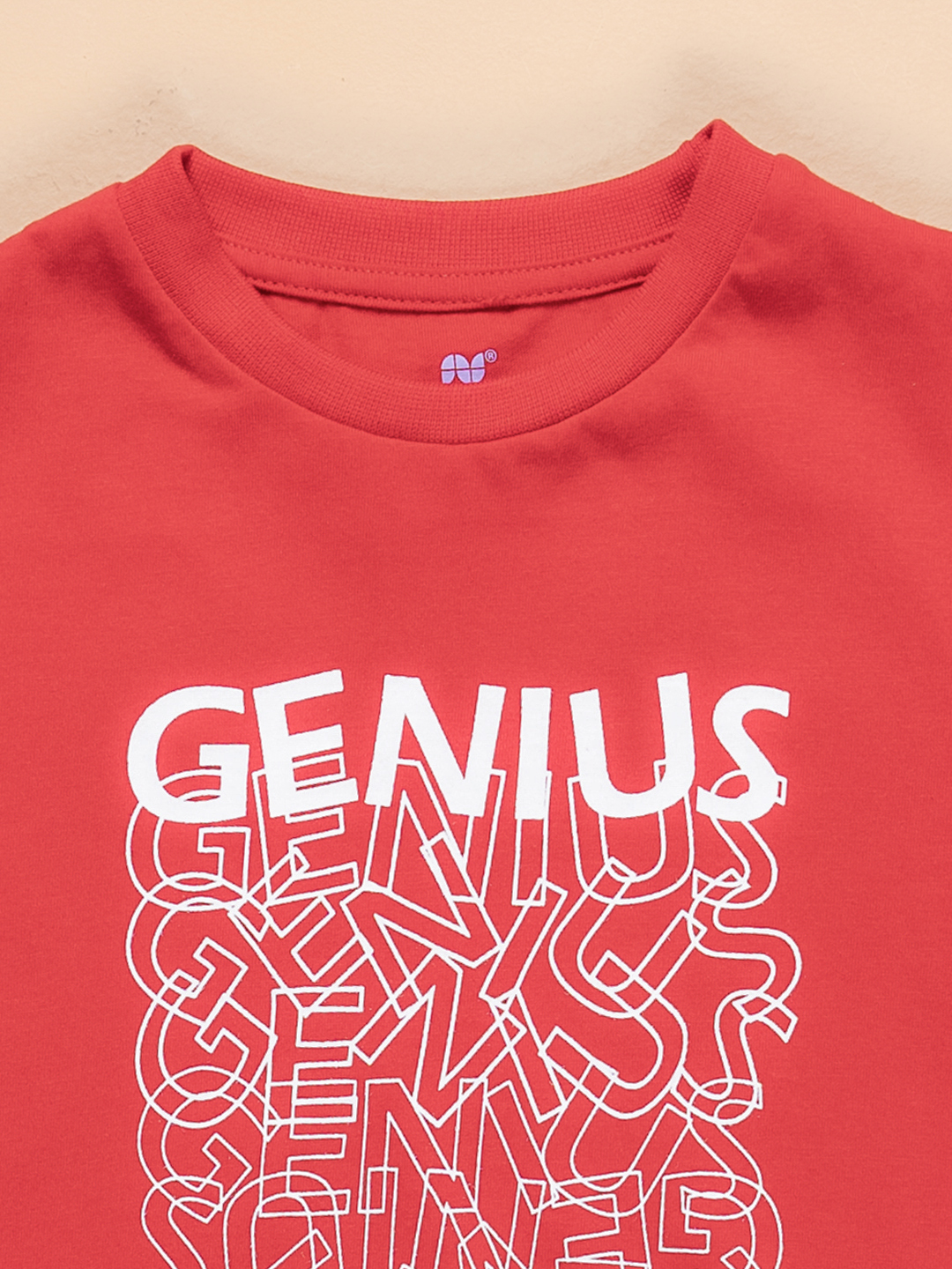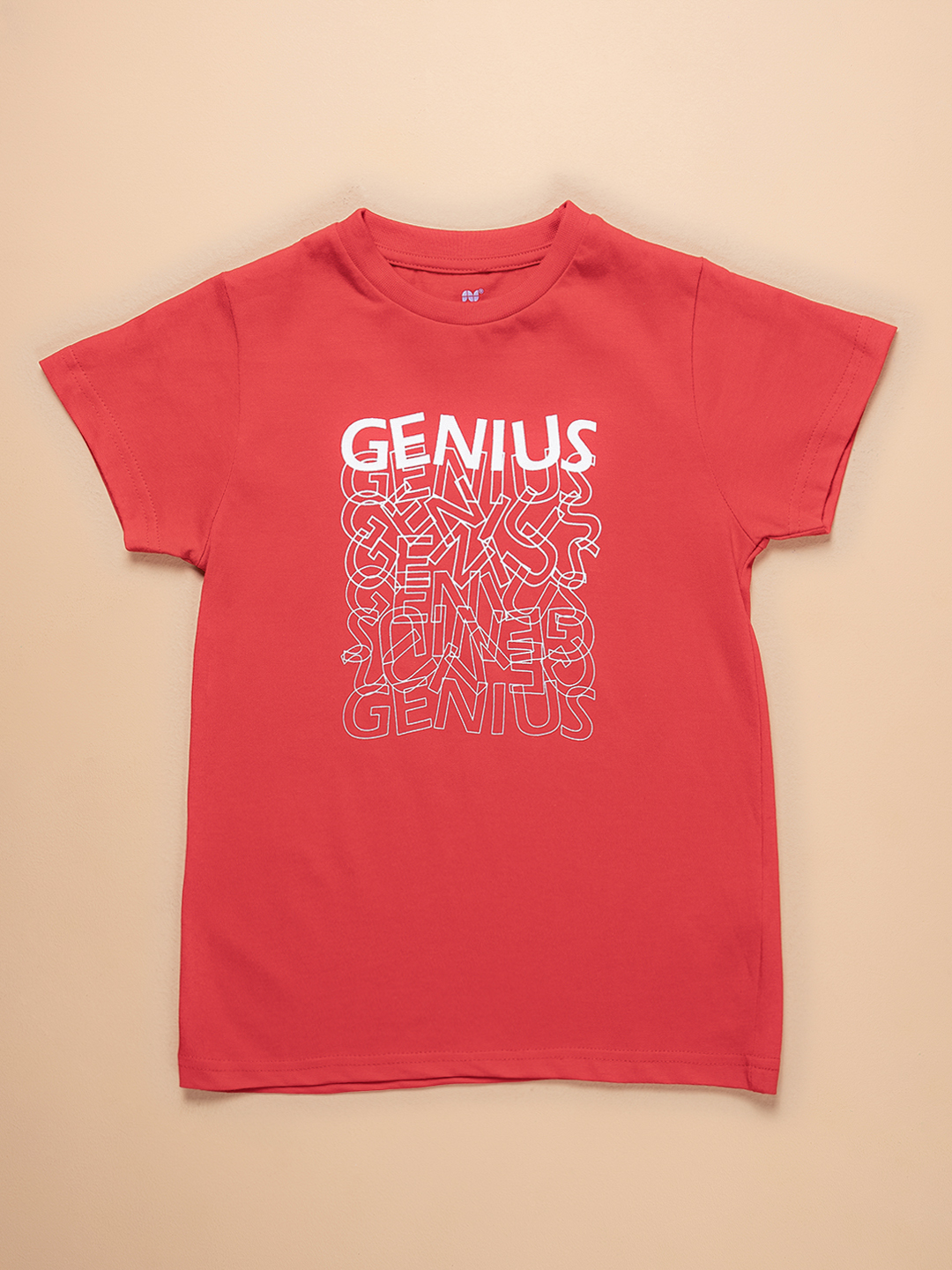 This boys T-shirt is made from soft single jersey fabric, providing breathable comfort for everyday wear. Designed in a bold red colour, it features a striking “Genius†graphic print that adds a f...
